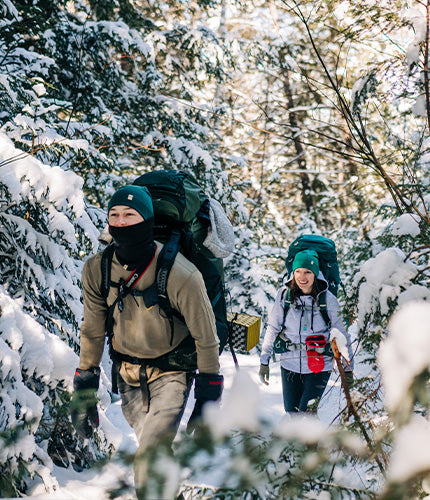 people hiking in the winter wearing midweight thermal layers and midweight balaclavas that are 100% merino wool people hiking in the winter wearing midweight thermal layers and midweight balaclavas that are 100% merino wool