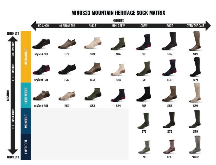 The first thing you will need to decide is what height & weight you want. Below is a full matrix of our Mountian Herratige sock collection.